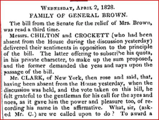 Representative David Crockett lost the debate, dude. The House passed the bill granting welfare relief to the widow in the name of providing for the general welfare.