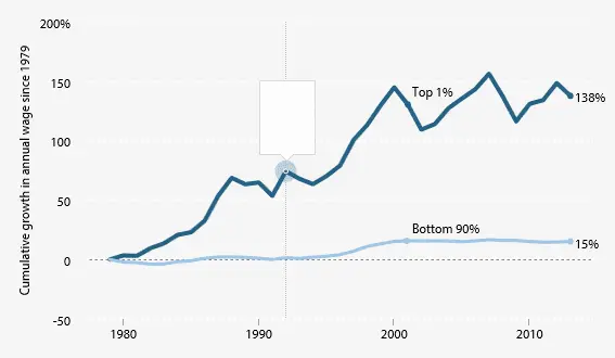 When it comes to the pace of annual pay increases, the top 1% wage grew 138% since 1979, while wages for the bottom 90% grew 15%: Cumulative change in real annual wages, by wage group, 1979–2013