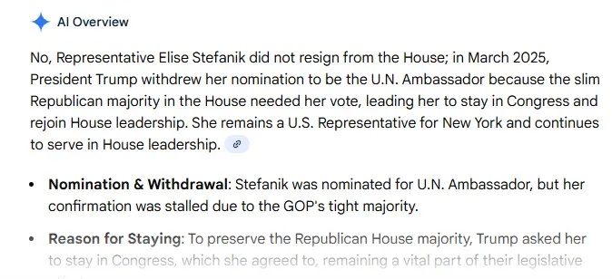Nothing. She's a puppy dog who parrots every Trump position. That's why she's getting demolished in the polls. People hate Trump.What has Stefanik stated that disparaged Trump? I haven't seen anything.![]()