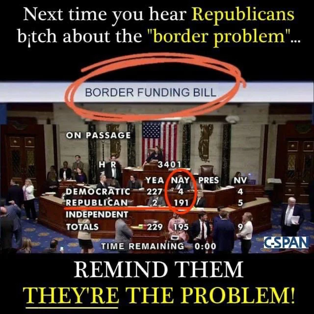 /—-/ We voted for Trump to solve the border. Mission accomplished.You're too stupid to even know what the argument is: Republicans showing time and again that they don't want to solve the border, just campaign on it. You're trying to argue the bill's passage instead of Republican intent.