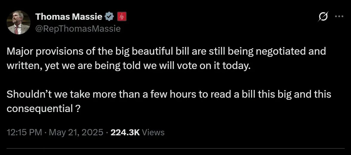 “Major provisions of the big beautiful bill are still being negotiated and written, yet we are being told we will vote on it today,” Massie said in one X post on Wednesday. “Shouldn’t we take more than a few hours to read a bill this big and this consequential?”