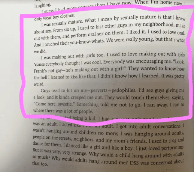There is a book called "Beyond Magenta," in which an early teen transgender - purportedly a real person, not a fictional character, talks about being "sexually mature" at six years old and how they kissed and had oral sex with both genders.