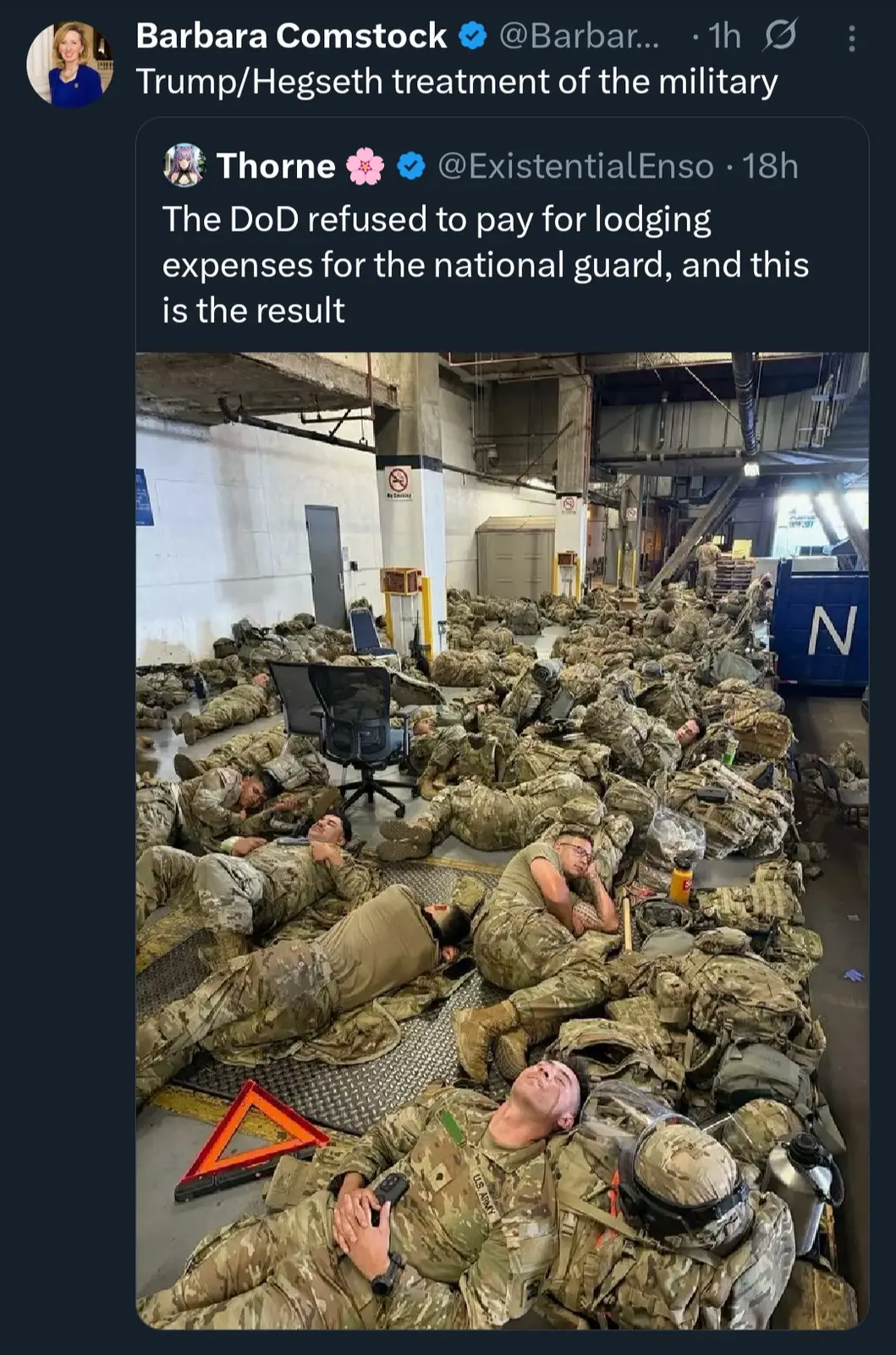 In the days following the January 6th Capitol riot, some National Guard soldiers who had been deployed to Washington, D.C. to help secure President Biden's inauguration were reportedly forced to sleep in a parking garage. This prompted widespread criticism and anger from politicians and the public.