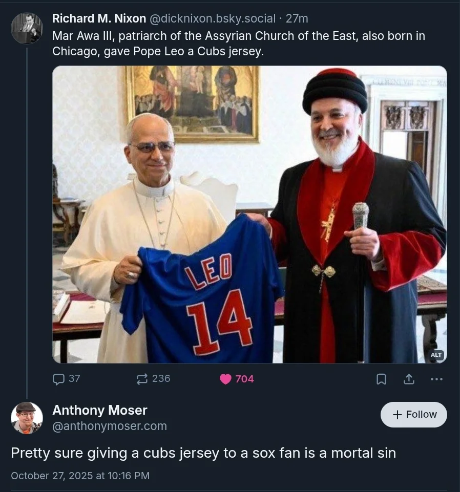 Toddsterpatriot Diamond Member Joined May 3, 2011 Messages 118,516 Reaction score 48,686 Points 2,290 Location Chicago Oct 27, 2025 #4,255 Synthaholic said: Actually made me lol View attachment 1178105 Click to expand... Is Leo still a Sox fan? Did he lose a bet?