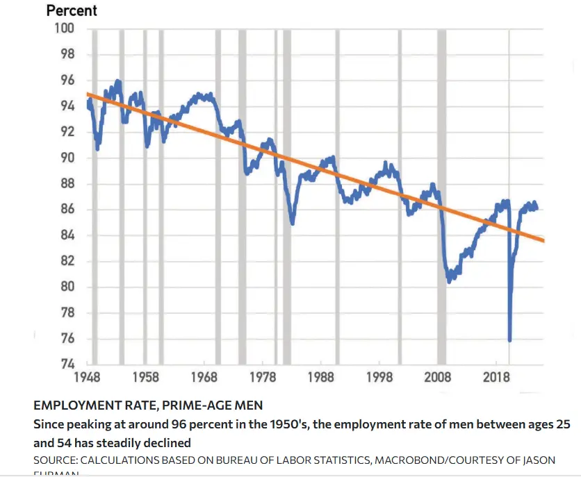 - Prime working age men employment has fallen steady since 1950s as the country has moved to service industry growth and college required jobs: both areas men are doing poorly
