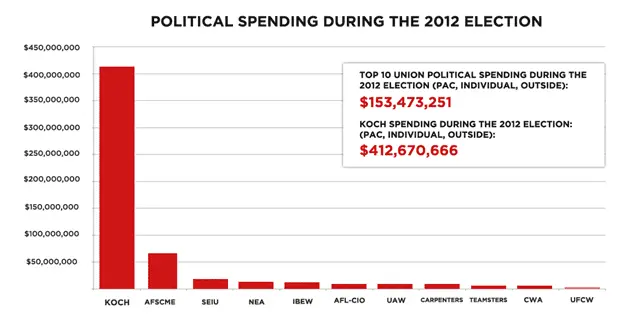 All NRLB-regulated unions, on the other hand, disclose every outside payment. Payments that cannot be found through the FEC can be found on a database maintained by the Labor Department. Individuals and corporations are under no such similar disclosure rules. The Koch money identified recently by the Washington Post, the $407 million, relates only to they money filtered through foundations and nonprofits. The money Koch spends as a corporate entity, which it has in the past, may have gone unreported - See more at: CHART Koch Spends More Than Double Top Ten Unions Combined
