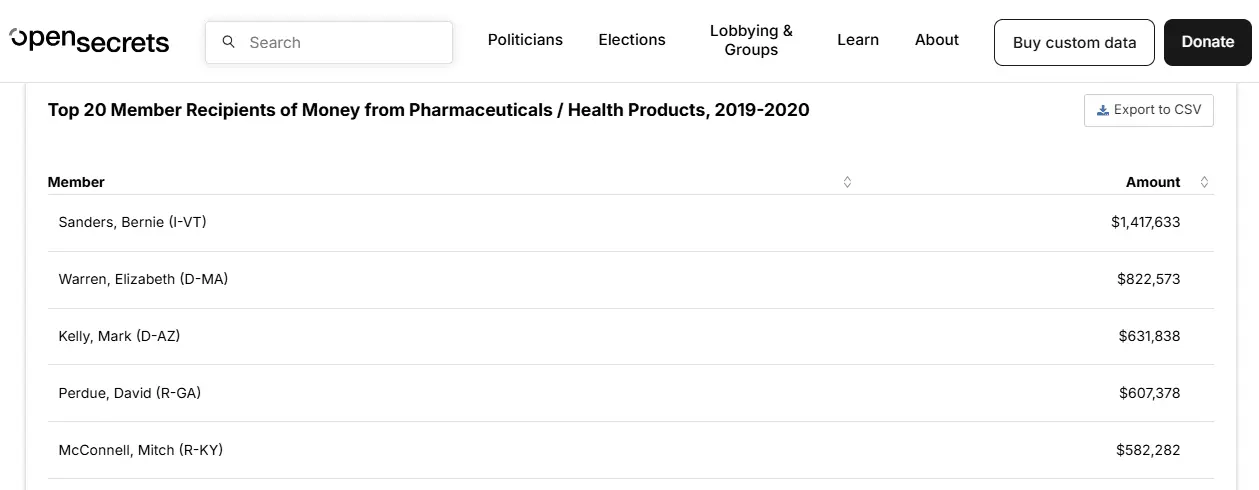 OpenSecrets.org report on Big Pharma campaign contributions 2020. Gues who is at the top? Bernie Sanders and Elizabeth Pocahantas Warren! LARGER IMAGE