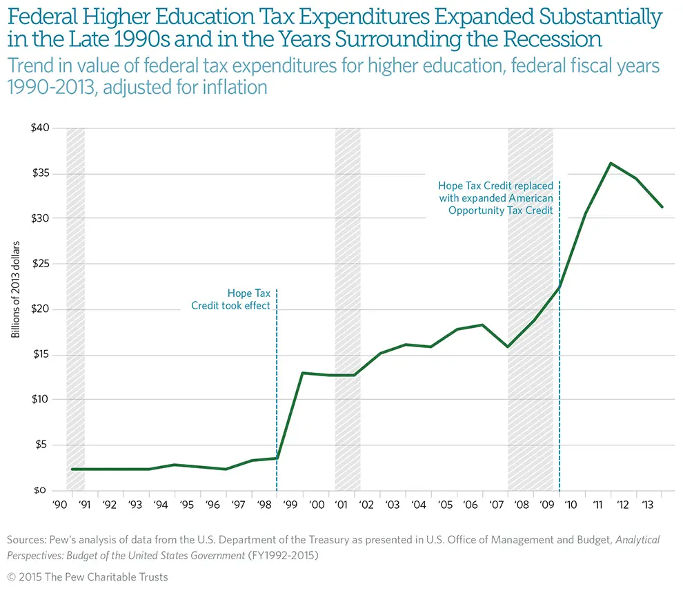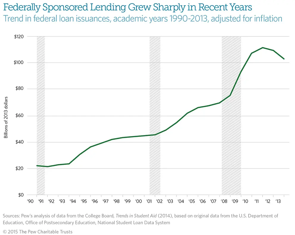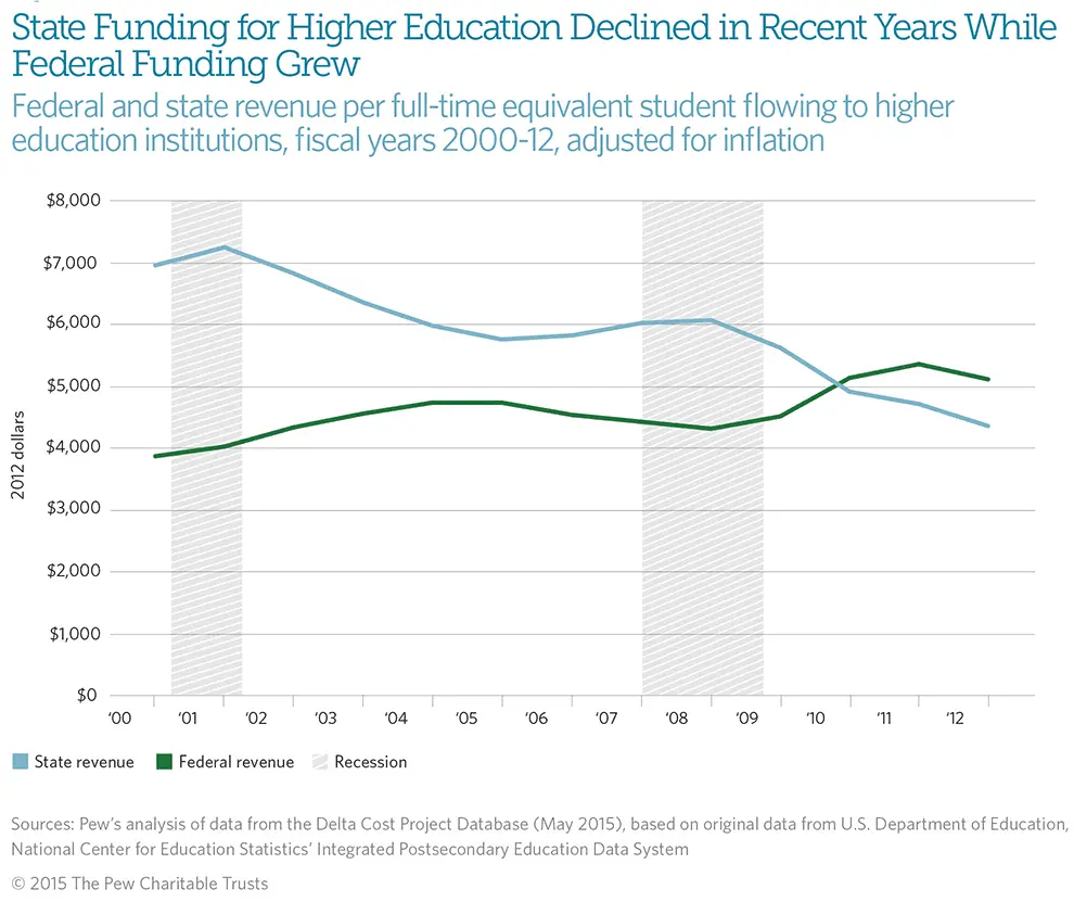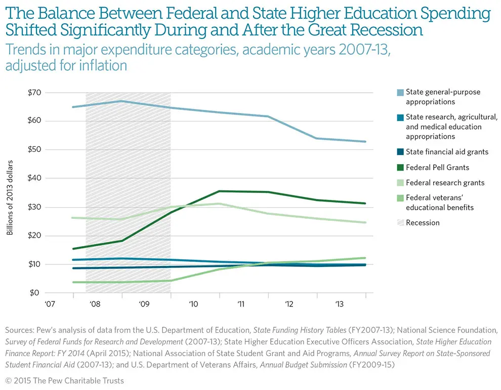 Historically, states have provided a far greater amount of assistance to postsecondary institutions and students; 65 percent more than the federal government on average from 1987 to 2012. But this difference narrowed dramatically in recent years, particularly since the Great Recession, as state spending declined and federal investments grew sharply, largely driven by increases in the Pell Grant program, a need-based financial aid program that is the biggest component of federal higher education spending.