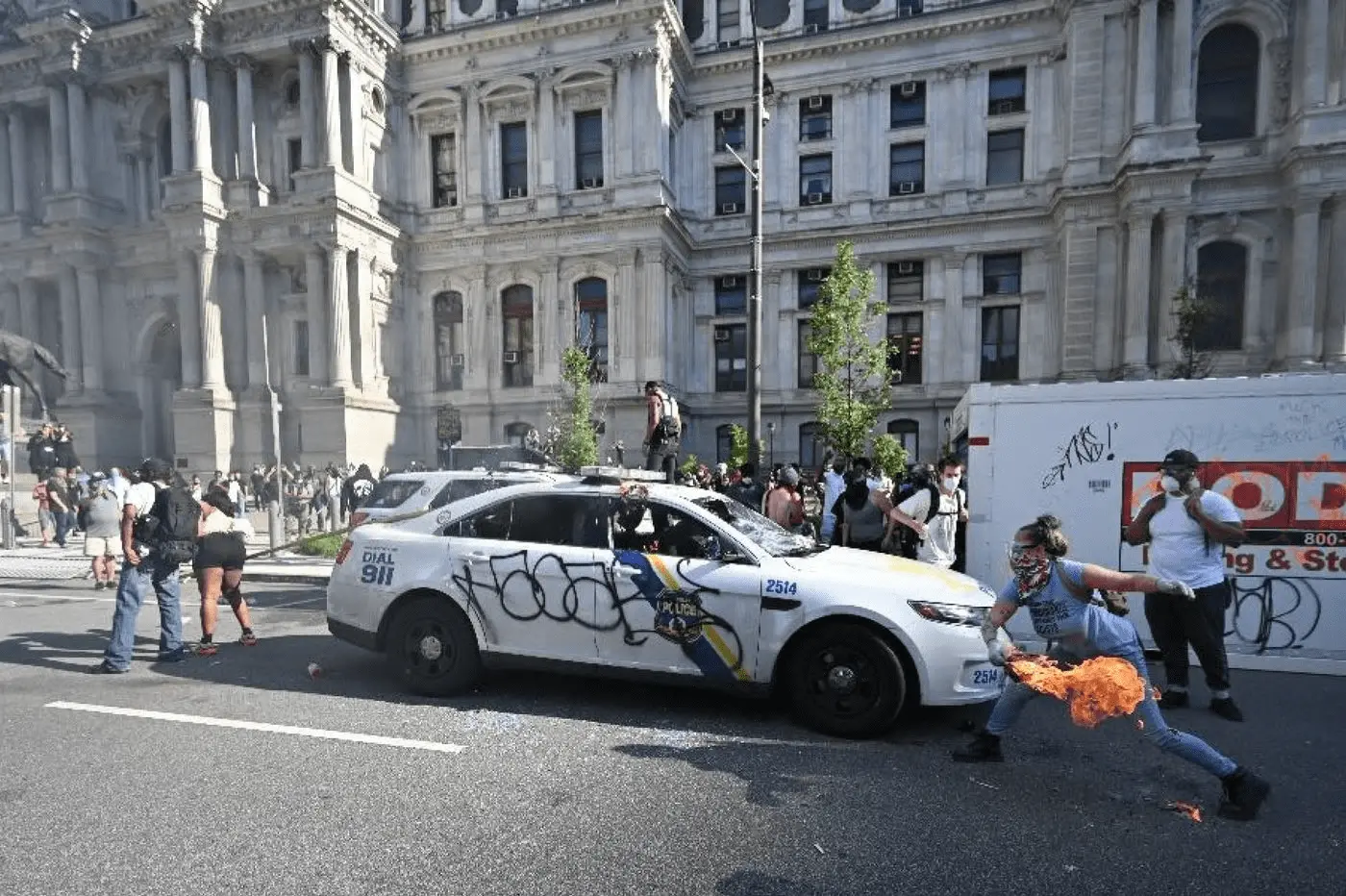 As demonstrators shouted, fires burned outside City Hall, and Philadelphia convulsed with outrage over the death of George Floyd, television news helicopters captured footage of a masked woman with a peace sign tattoo and wearing a light blue T-shirt setting a police SUV ablaze.