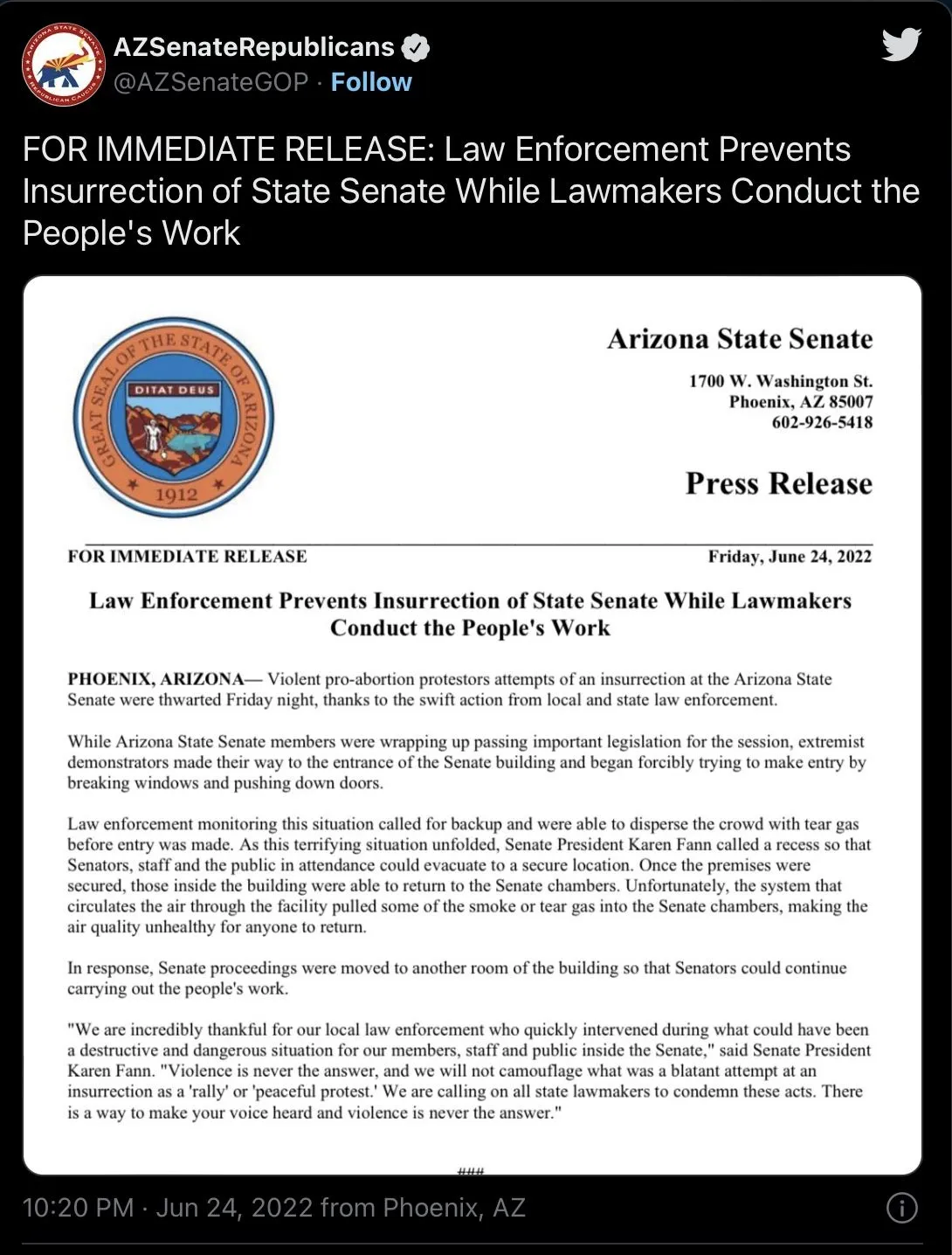 Sorry, but it wasn't an insurrection, as nobody was there to take over the government, they were just protesting the vote on abortion. If they had said that they wanted to throw out the elected officials and replace them (like they did on Jan 6th), THEN it would have been an insurrection. People need to actually learn what words really mean before throwing them around in a hyperbolic manner, politicians as well as the general public. And no, no politicians in AZ were taken hostage as none of the protesters took any of them because the police had the place surrounded, they were in protective custody, not hostages.