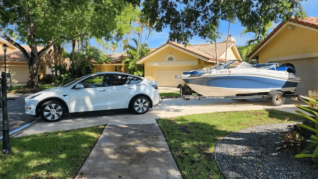 I did an image search for a model Y 3200 towing capacity, 4200lb curb weight.It's not legal. Not approved for towing in the USA. You can put a hitch on anything. That right there has a range of less than 100 miles. No way can that tiny little car tow that much weight legally. That boat and trailer weigh close to 3000lbs. That's a Model 3, not approved for towing in the US and only approved up to 2000lb anyway.