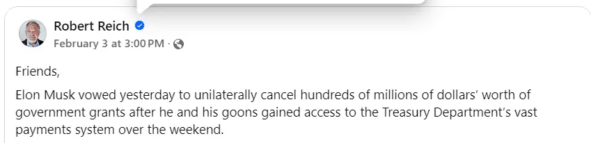 But Musk hasn’t been confirmed by Congress. His “department” was never authorized by Congress. No one other than Trump has given Musk any authority. No one knows exactly who Musk’s goons are; they have not been vetted yet are handling some of the most sensitive personal information in the government.