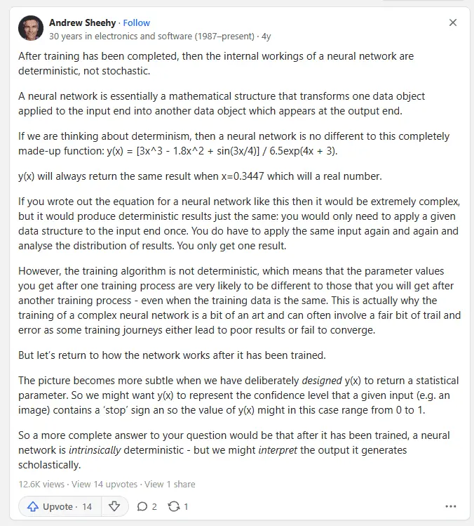 Today there is focus on extracting the Volterra kernels from discontinuous nonlinear time series. This would have been completely impossible with deterministic networks. In real life this translates into "how to confuse an AI". If you say "I take my coffee with cream and sugar", most networks can figure out what you're saying. But if you say "I take my coffee with cream and.... (delay).... (cough, stutter).... um.... dog", most networks will become horribly confused.