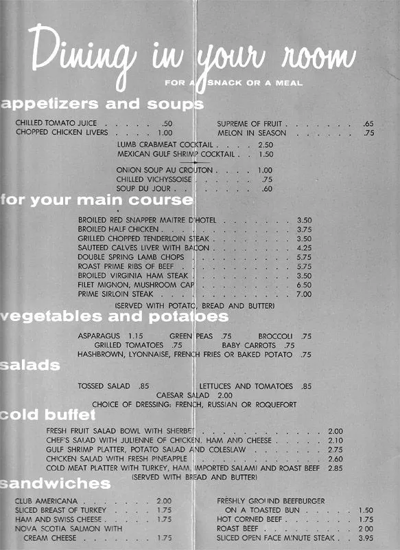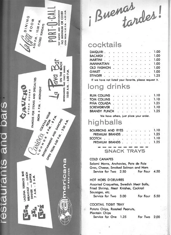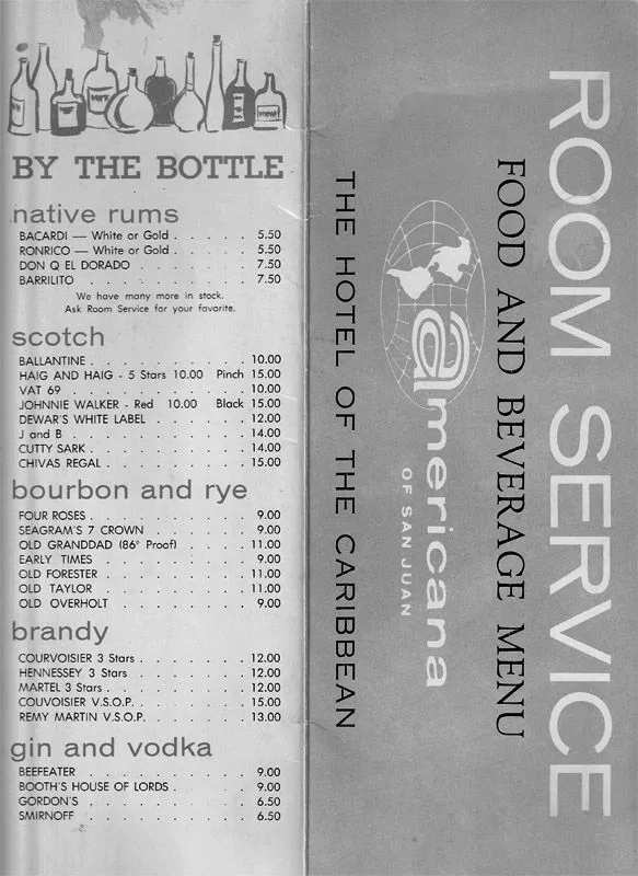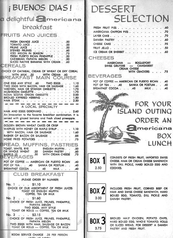 One of the things I found today is a room service menu from the Americana of San Juan. My aunt went there when it first opened which, so far as I can tell, was in 1967.