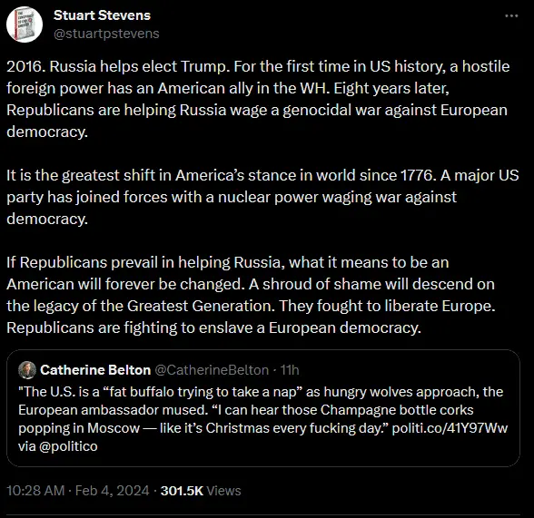 There is little doubt any longer that Russia has recruited assets in the U.S. government, Congress, and Media. This thread starts with a warning from long-time Republican strategist and campaign manager Stuart Stevens.
