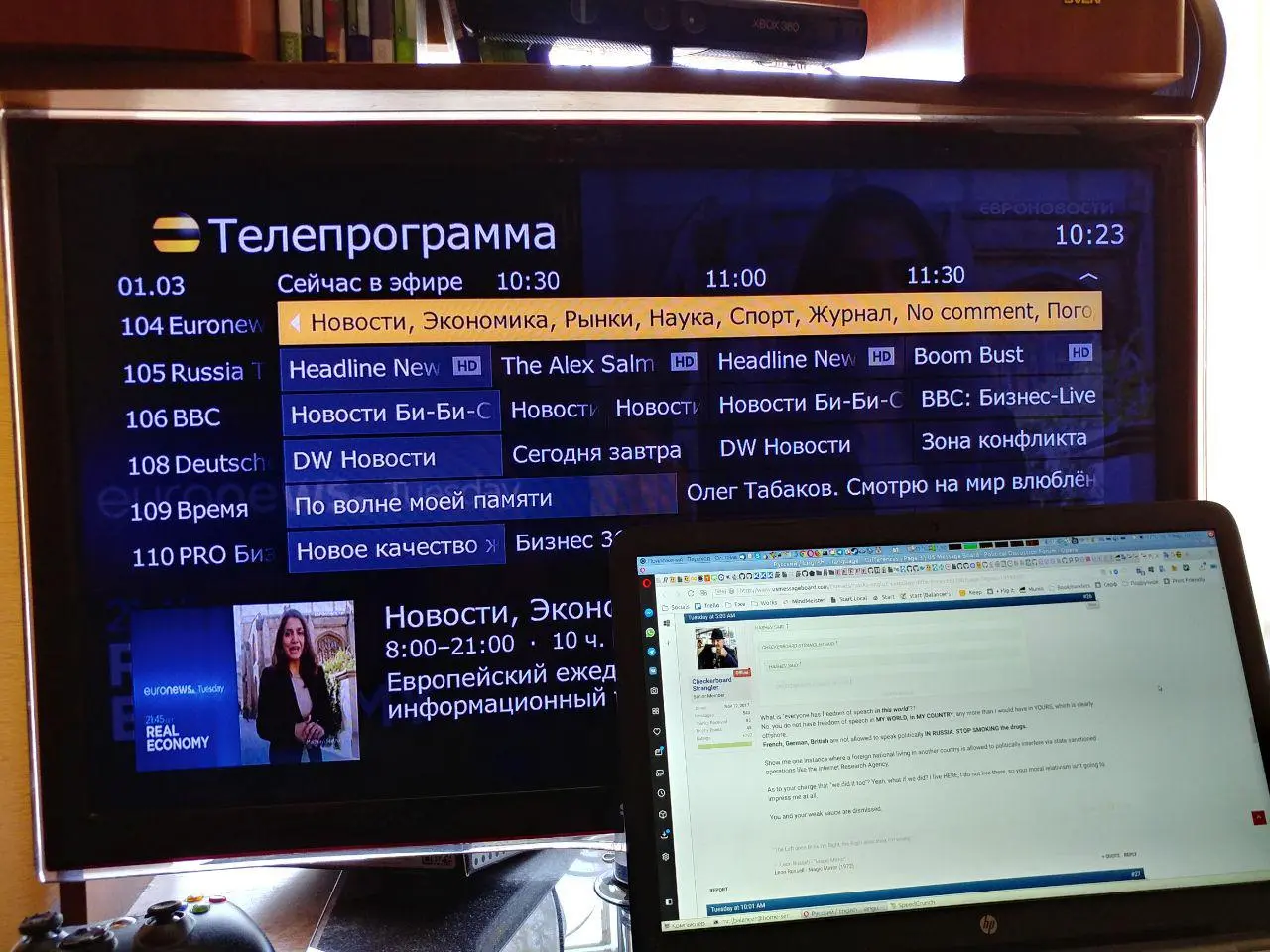 Russia is now responding to information sanctions from the US begins to conduct a fairly strict information policy. Nevertheless, I can watch Euronews, BBC, Deutsche Welle, France24 and other Western channels on TV.