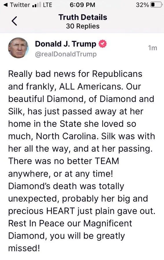 "The World just lost a True Angel and Warrior Patriot for Freedom, Love, and Humanity! Please respect the privacy of Diamond’s family! Memorial Ceremony TBA. Contributions towards Preserving Diamond’s Legacy are only being accepted at the following link:"