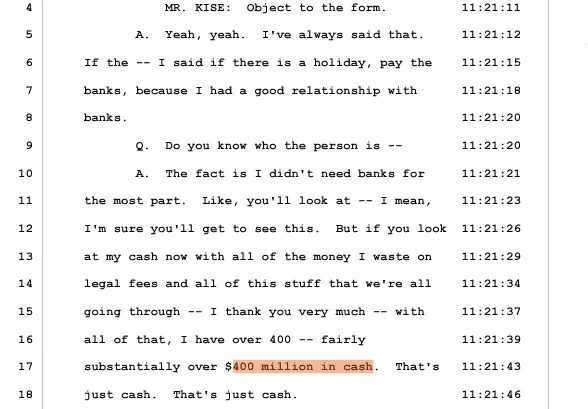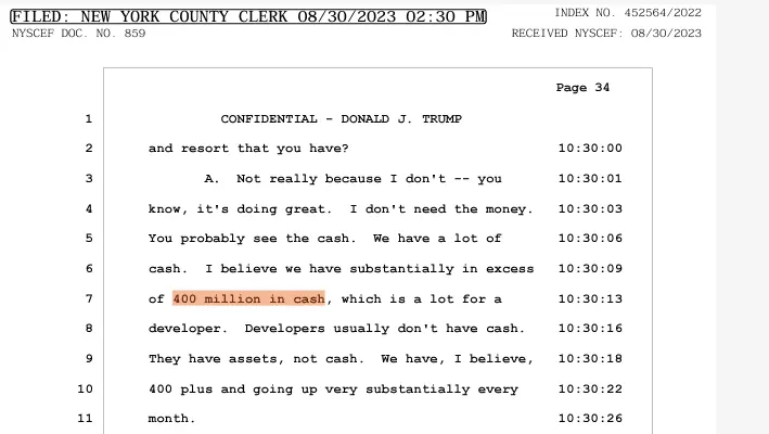 My God people, it's not that hard to find. FPOTUS#45 saying he had $400 Million in cash (and growing substantially every month) if from his April 13, 2023 deposition in the fraud case.
