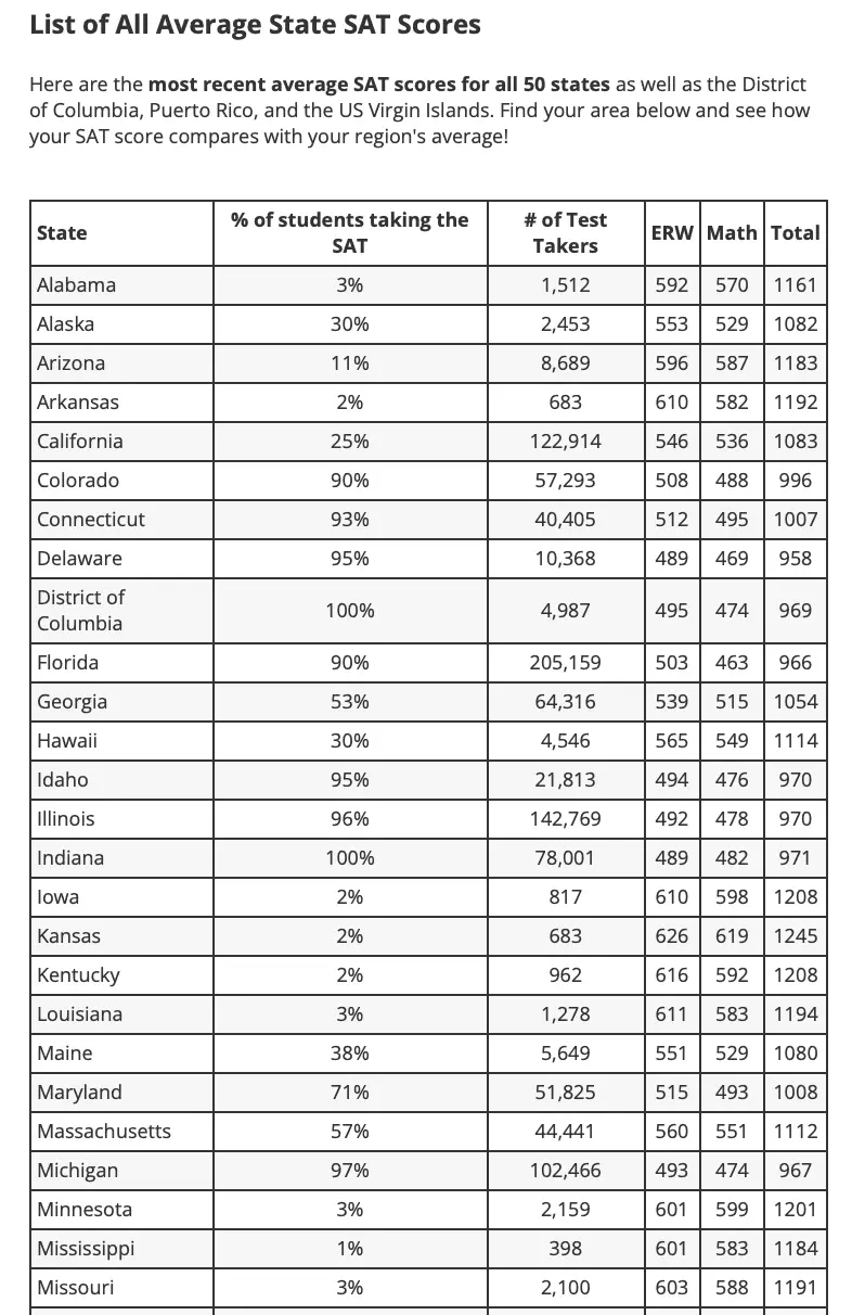 Although Wisconsin lands in first place for the highest SAT Math score at 629 points—108 points higher than the nation’s average—it also had one of the nation’s lowest number of test takers. In 2022, only 2% of Wisconsin’s high school seniors participated in the SATs.