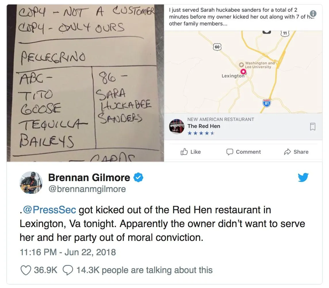 What a loon. The waitress posted about Sanders being 86ed. The restaurant tried to claim her ouster as a trophy. She posted the facts. But I can see why that disturbs you.