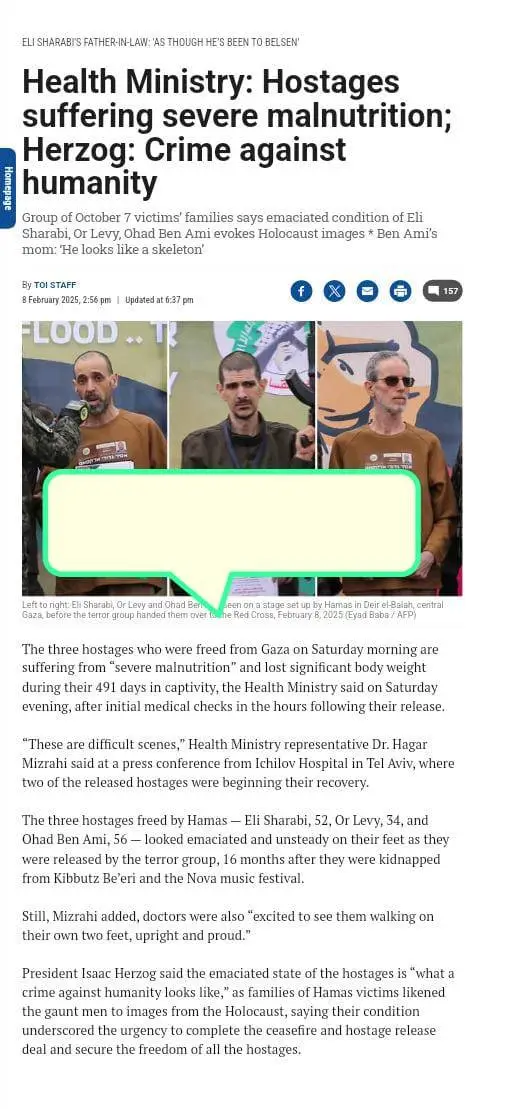 ''But the images tell the truth: Hamas terrorists and the Gaza crowd gathered there to humiliate them appear in a very well condition, while the Israeli hostages alone bear the unmistakable signs of starvation. This is clear evidence of war crimes and blatant violations of international law by Hamas, evoking haunting images from not-so-distant history—moments when the world remained silent.''