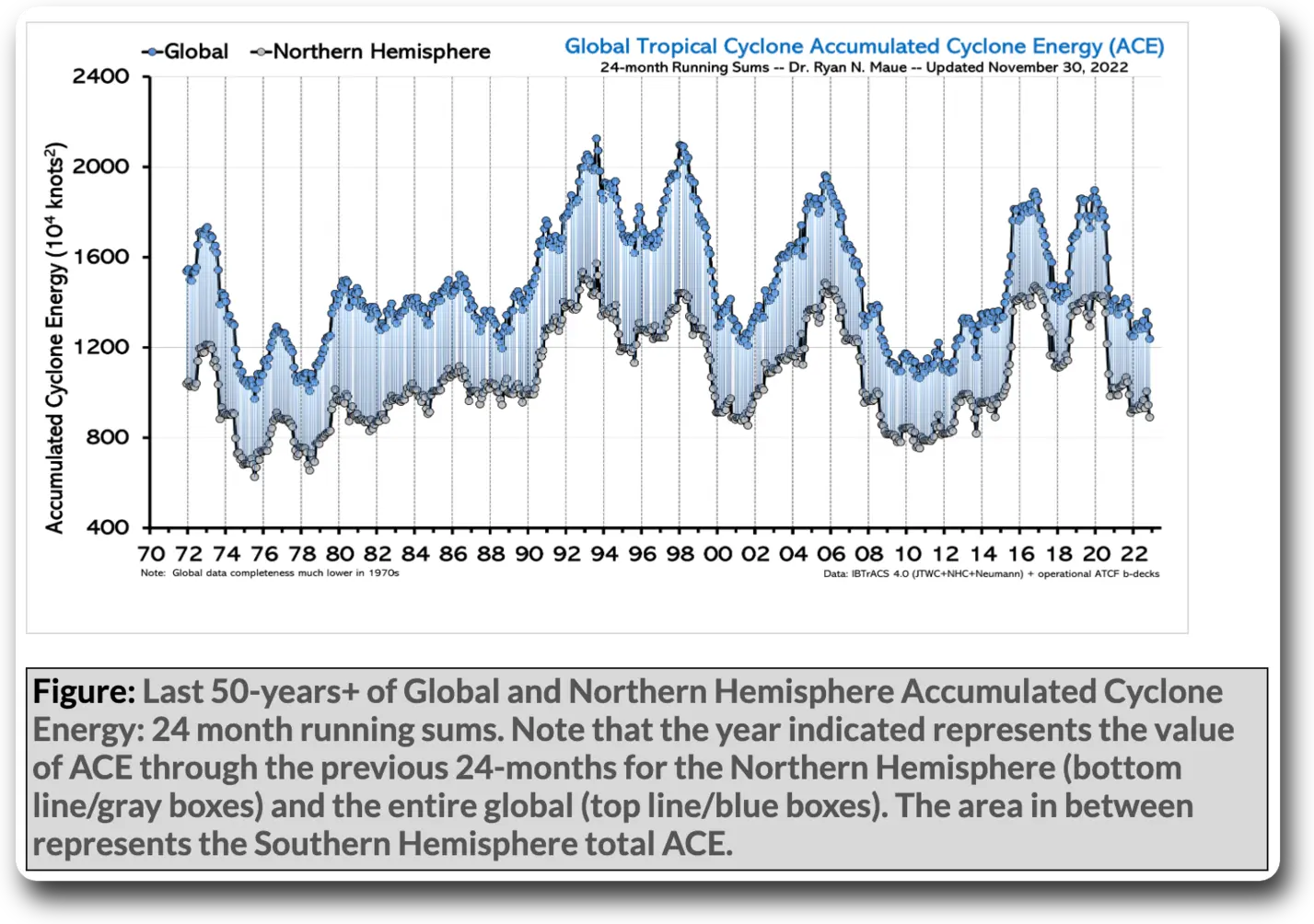 And here is the global hurricane frequency, both for all hurricanes and for the strongest hurricanes.