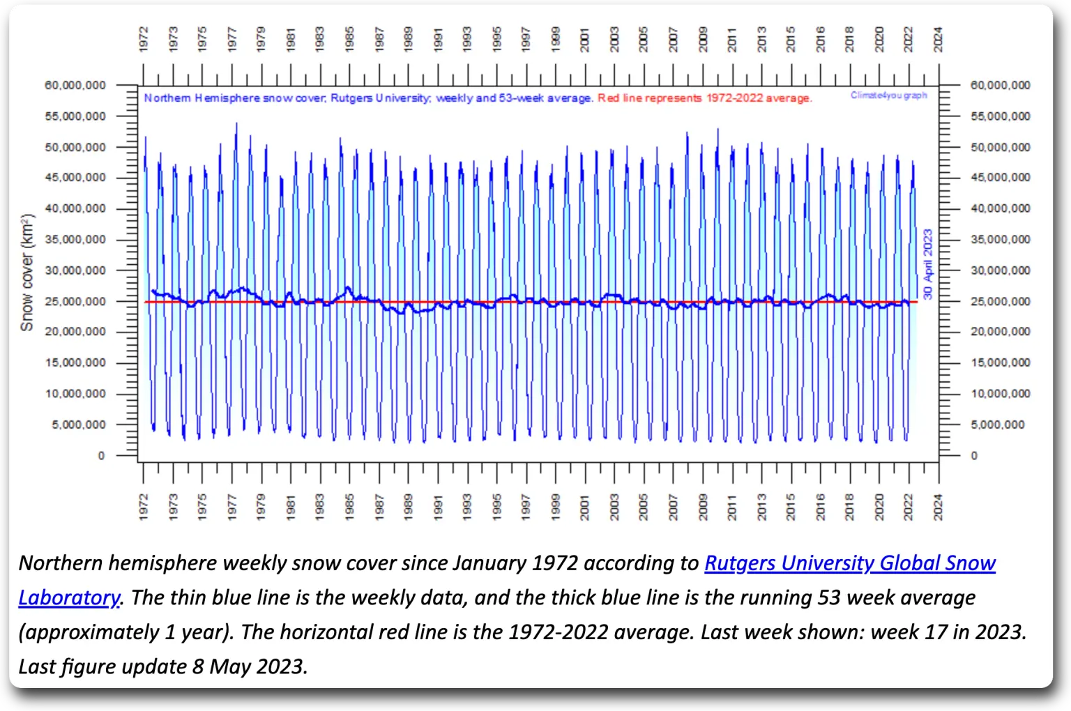 And here is the Rutgers Snow Labatory’s snow extent data from 1972 to April 2023 … basically, no change.