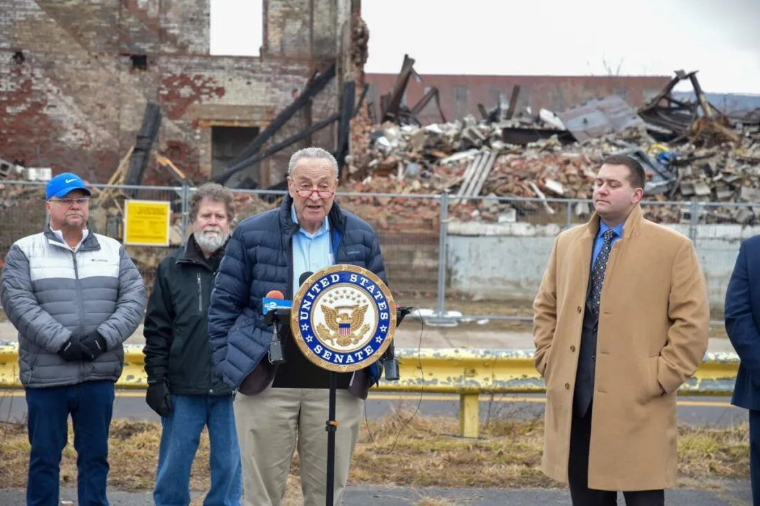 Senator Chuck Schumer held a press conference at the site of the fire that destroyed the empty building that once was the Crawford Furniture plant in Jamestown, New York. He suggested that the Superfund program clean up the "toxic eyesore". That is definitely needed. Then the property will be available to be used for something else. I don't think that will happen. Crawford closed the plant on December 31, 2012, when it went bankrupt.