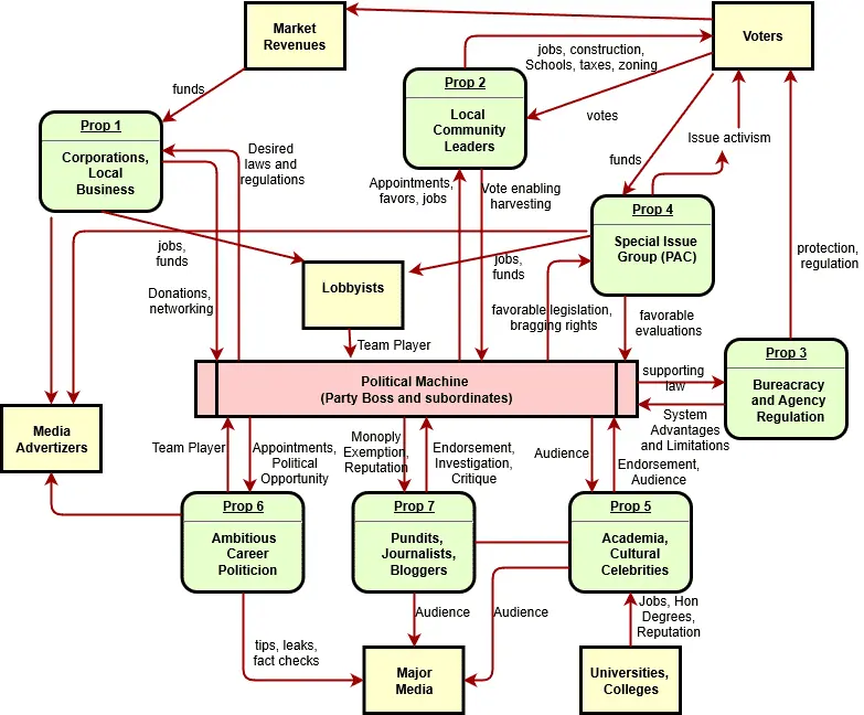 I made up this chart to illustrate the pieces of a typical corporate crony network with a political machine.