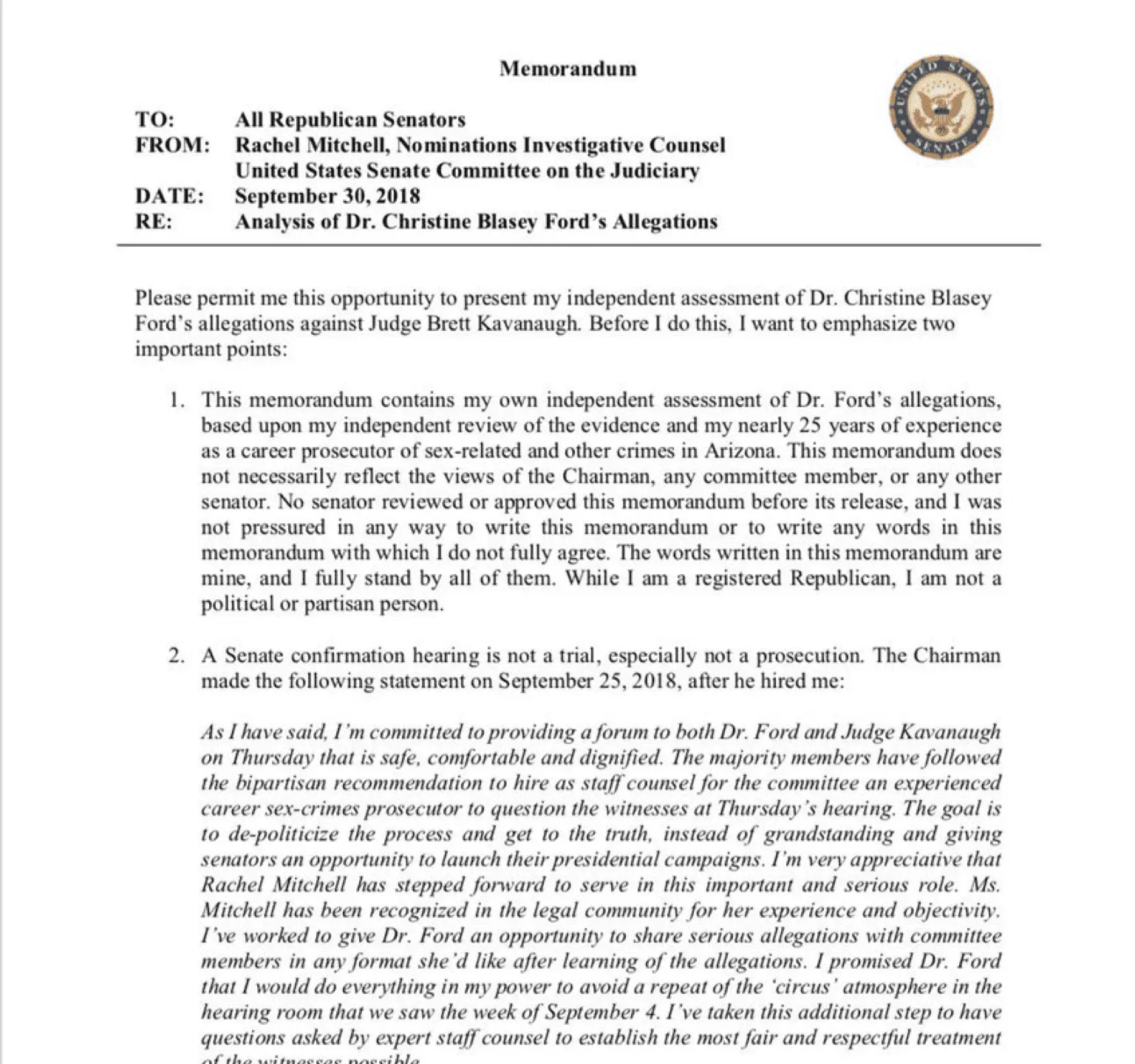 After a careful review of all of the evidence put fourth by Dr. Christine Blasey Ford in her accusations of sexual assault against Supreme Court nominee Judge Brett Kavanaugh, sex crimes prosecutor Rachel Mitchell has released a report which completely exonerates the judge.