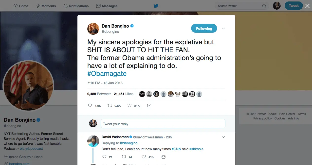 In interviews last week, Bongino described the brewing storm over the Steele Dossier as “the most explosive scandal”: