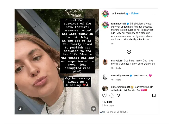 266 likes, 92 comments - romineustadt on October 20, 2024: "Shirel Golan, a Nova survivor, ended her life today because monsters extinguished her light a year ago. May her memory be a blessing. And may we shine our light and share our love so abundantly in her honor.".