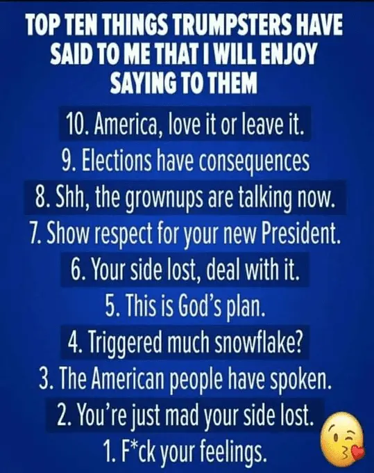 Four years ago around this time, USMB conservatives/Republicans/rightwingers couldn't stop posting "Suck it up!", "elections have consequences" and "If it makes a Democrat/lefty" upset, it must be a good thing."