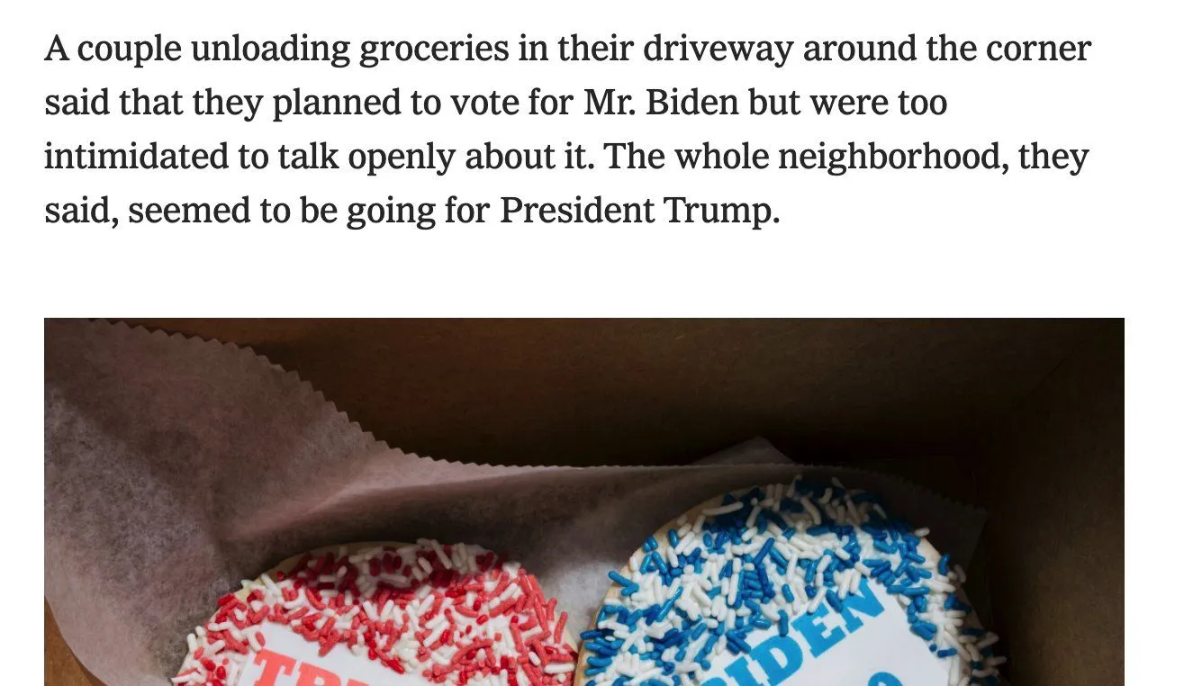 I live in rural Ohio and I can tell you there’s a lot of shy Biden voters. The Trump supporters here are overly aggressive and intimidate anyone who doesn’t support their views. I was wearing a Biden hat in a store and had an elderly man thank me quietly and asked how I got it.