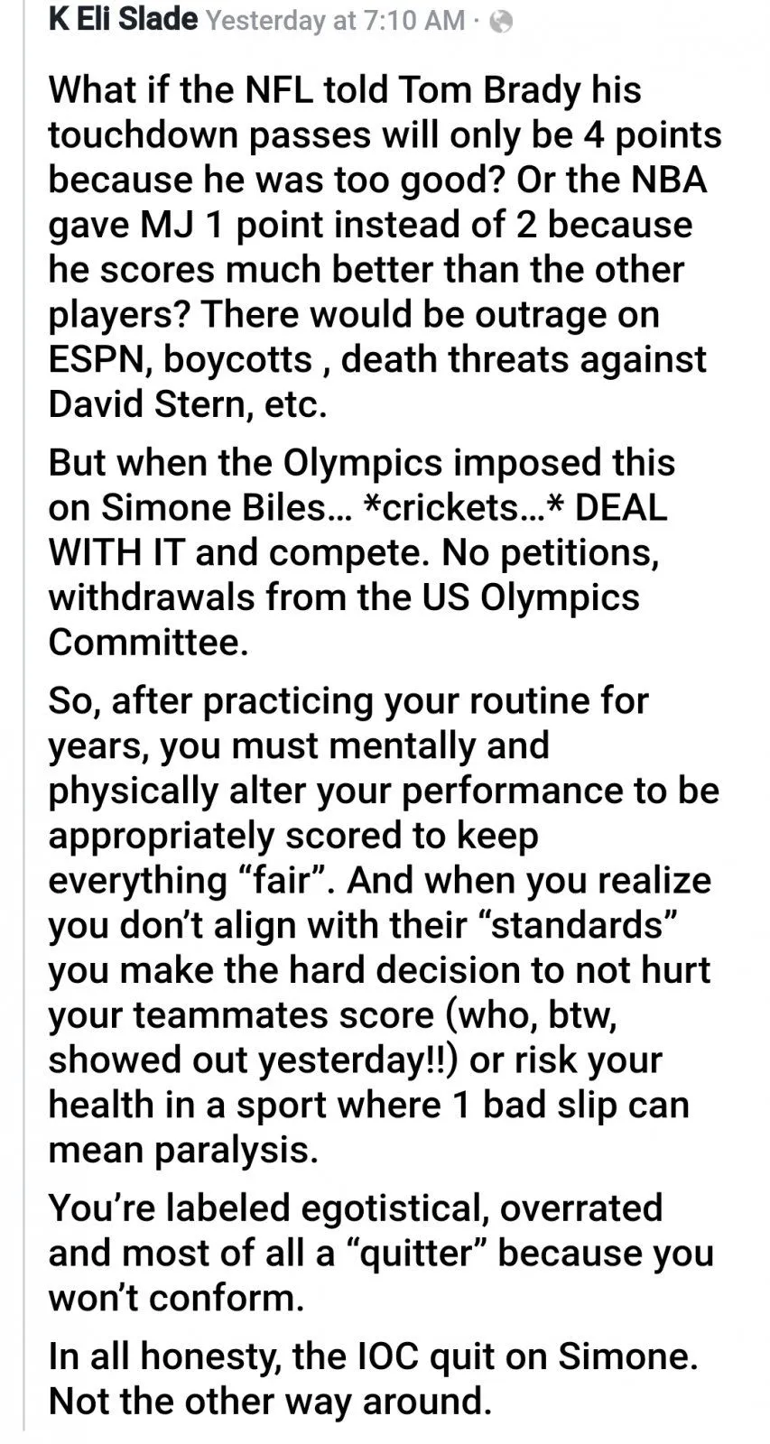 There was a time when all of the American athletes in the Olympics were amateurs and could not get paid for endorsements until after their careers. It slowly became muddled in different sports and then the donnybrook broke loose. Social media has become a monster on top of it with the TV media becoming politicized. Simone has made money while still being an athlete. that opens her up to criticism. The psyche problem issues are something else and understandable and the balance of personal enrichment and privacy concerns tilted to far onto one side.I remembering hearing how they wouldn't let Kareem Abdul Jabbar dunk in college. This is basically the same thing.
