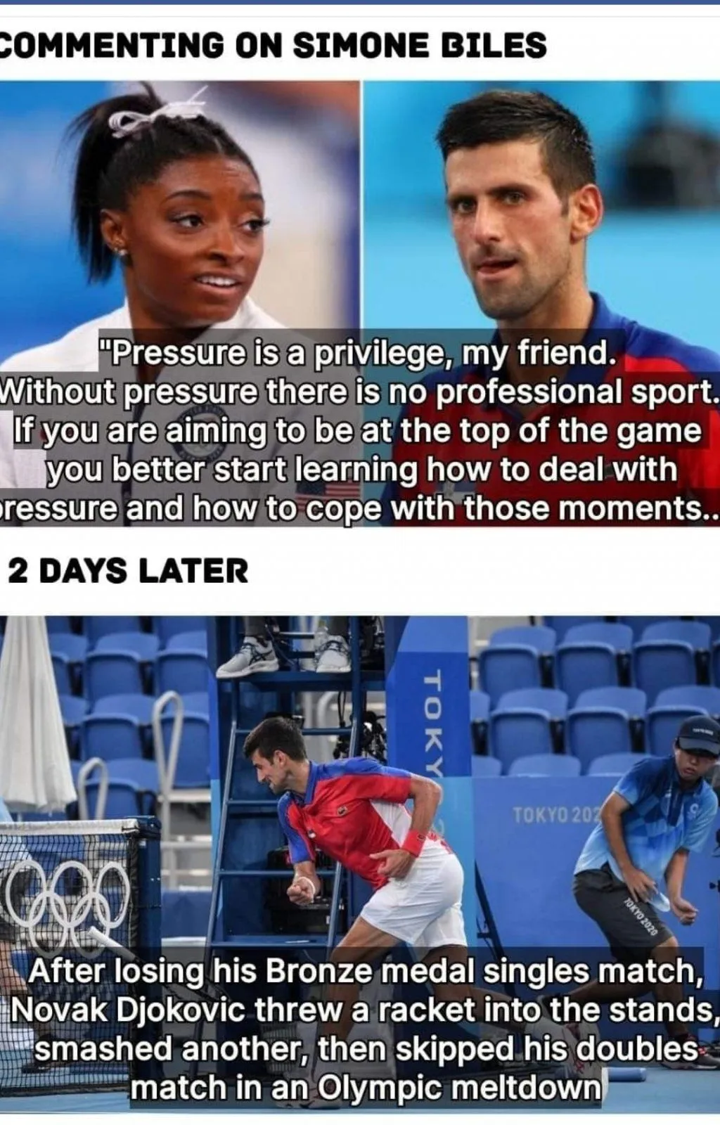 Plus Djokovic’s match was FINISHED. He didn’t quit even though he was down. And yes he is known to be hard on himself and lose his temper and break rackets. He expects excellence from himself and gets angry if he doesn’t live up to his own expectationsExcept this last time when she just threw in the towel. Djokovic is on the nose and BJ King has said the same thing. Pressure is a byproduct of excellence. It makes an athlete compete harder.