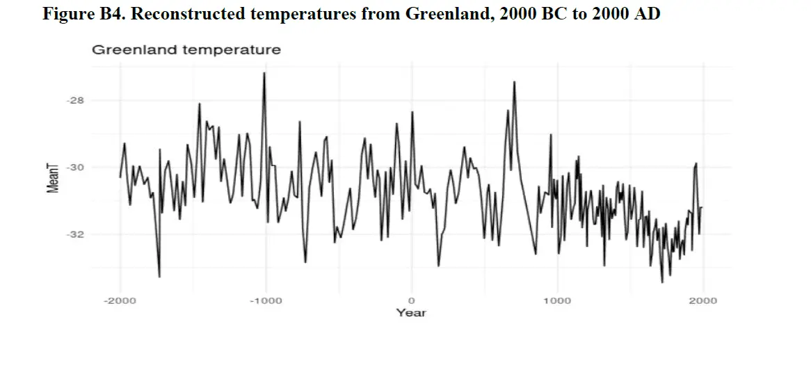 "...Kobashi et al. (2011) have reconstructed Greenland surface snow temperature variability over the past 4,000 years (until 1993) at the GISP2 site (near the Summit of the Greenland ice sheet) with a new method that utilizes argon and nitrogen isotopic ratios from occluded air bubbles (Figure B4, Appendix B). These data indicate that warmer temperatures were the norm in the earlier part of the past 4,000 years, including century-long intervals nearly 1°C warmer than the decade (2001-2010). Therefore, it appears that the current decadal mean temperature in Greenland has not exceeded the envelope of natural variability over the past 4,000 years. Schönwiese (1995)has reconstructed temperatures from ice cores in Greenland for the last 11,000 years (Figure B5,Appendix B). These reconstructions show that during the past 10,000 years temperatures over long periods were higher than they are today. The warmest phase occurred 4,000 to 8,000 years ago and is known as the Holocene Climate Optimum or the Atlantic Period..."