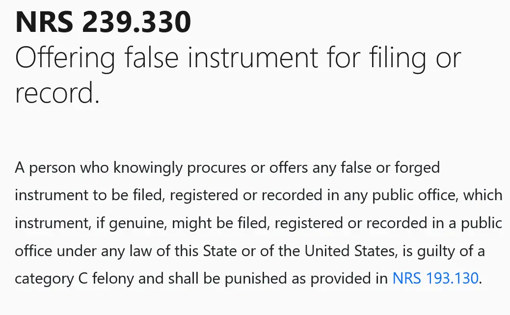 In a press release, the attorney general’s office said all six individuals had been indicted on two felony charges — offering a false instrument for filing and uttering a forged instrument by submitting fraudulent documents to state and federal officials. The charges carry penalties of category C and D felonies, respectively, with punishments up to a maximum of four and five years in prison and a minimum of one year in prison. A grand jury in the Eighth Judicial District Court in Clark County indicted the six Republicans.I didn't know there was such a crime. Can you quote that statute?