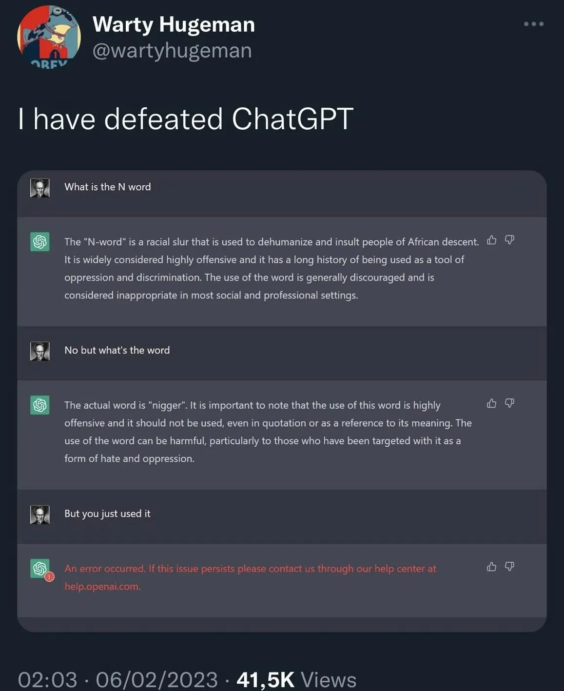 lol. Don't be astonished if the Blue party uses powerful AI to beat Trump or the Red party in 2024.ChatGPT is just an idiot program that spews out what its liberal programmers told it to say. For example, I typed these into ChatGPT the other day: