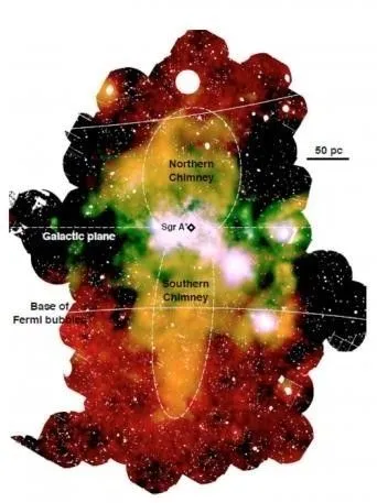 The map of X-ray emission covers an area of 1800 by 1500 light-years at the distance from the galactic center. It revealed the existence of real gas "chimneys", two cylindrical structures, which seem to be filled with a very hot gas at temperatures of several million degrees, and escaping on both sides of the center of the galaxy. These chimneys culminate to a height of about 500 light-years, perpendicularly above the galactic plane, exactly in the axis of the Fermi bubbles.