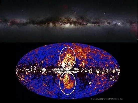 Above: image of the galactic plane in visible light. In the center of the image, the center of the galaxy sheltering the massive black hole is totally obscured by the dust. Bottom: image of the galaxy observed in very high energy gamma rays by the Fermi satellite. From the center of the galaxy on either side of the galactic plane, two large emission zones called "Fermi bubbles" (highlighted by the ellipses) were discovered in 2010. © Fermi / Nasa.