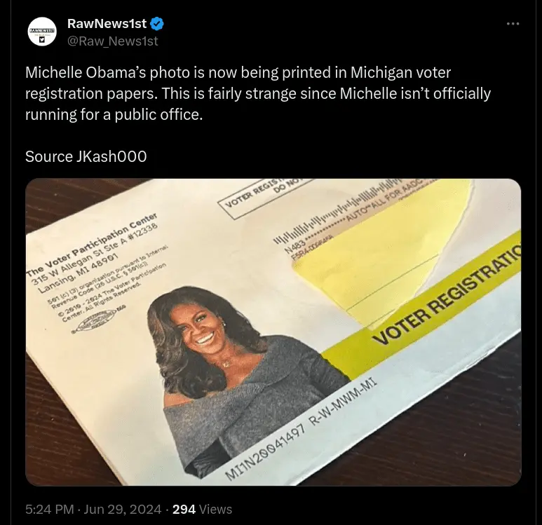 Blind squirrel award of the day.Actually, no. I saw this one just yesterday and debunked it. Supposedly is was a Michigan voter registration form with Michelle Obama's picture on it. It only took me a couple seconds to figure out that it was from a left-wing 301(c) "get out the vote" organization...