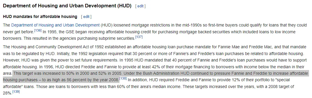 Clinton's HUD forced Fannie and Freddie to buy 50% subprime mortgages.