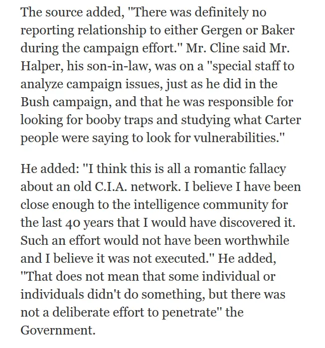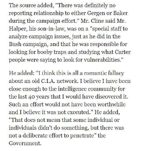 From your link:From one of your Right-wing-nut sources so you can't whine like a child, "fake news."I asked when Reagan planted FBI spies in the Carter campaign as you claimed.Really, you know-it-alls didn't know that one?Really? When did Reagan do that?Ever since REAGAN did it against Carter.