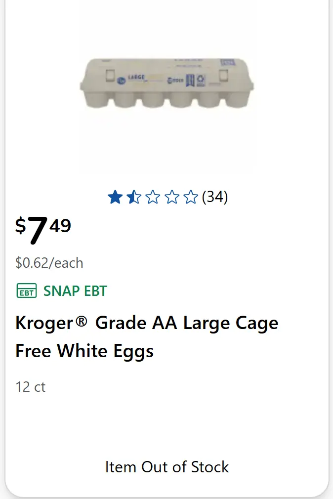 8 bucks for 18 currently at walmart......great value brand. just like your post, they have 3 stars with 40% giving them 1 star crying they are cracked, do people NOT check the eggs before buying them?, you always do. They also don't pack them right and they get damaged from store to their door. The times I bought store eggs I have yet to have one cracked when I unpacked them.