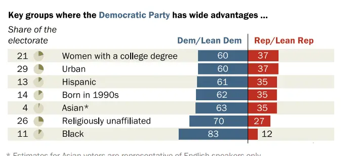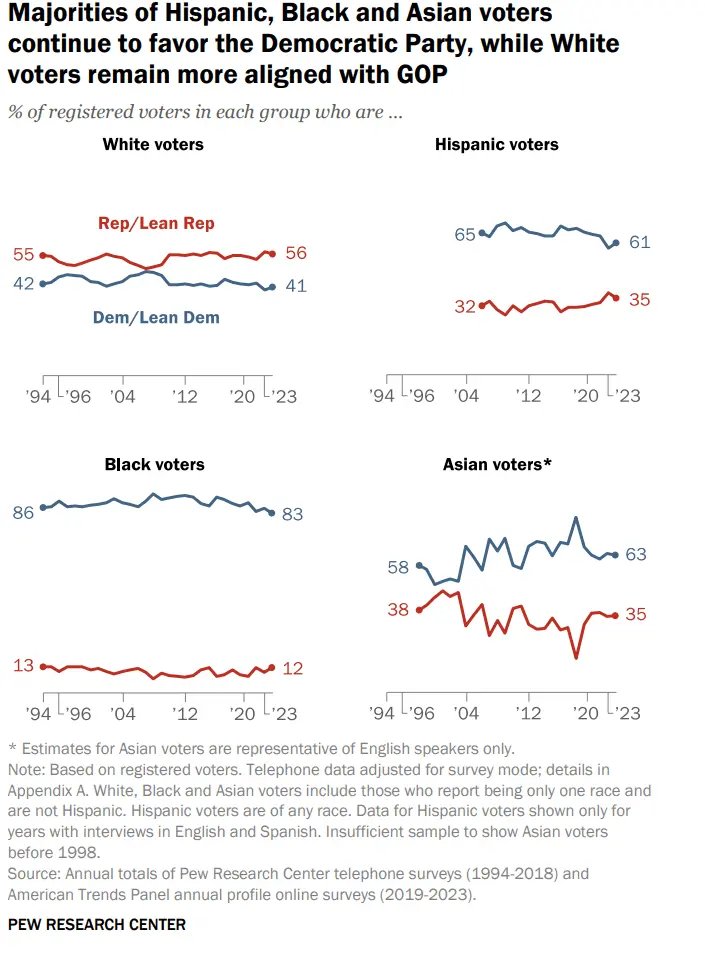Hispanic voters (61%) are Democrats or lean to the Democratic Party, while 35% are Republicans or Republican leaners.