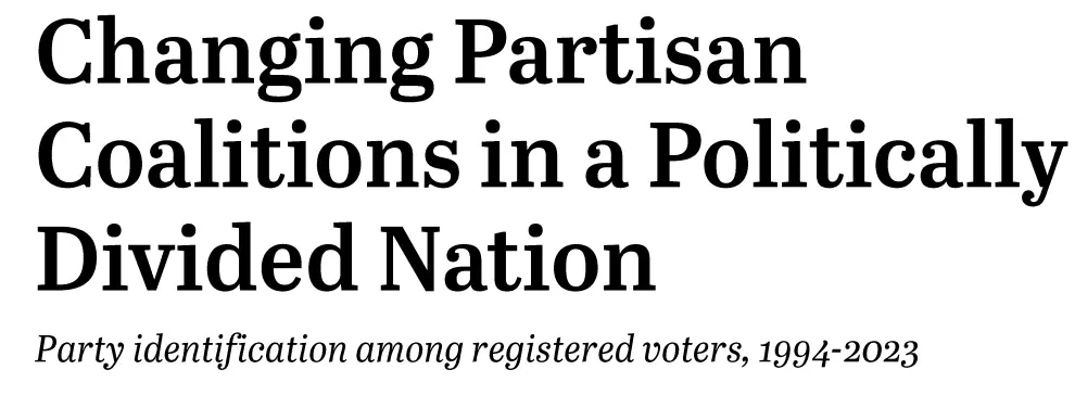 - As recently as 2020, the share associating with the Democratic Party was 5 percentage points higher. That somewhat larger edge in party affiliation had been in place for much of the last two decades.