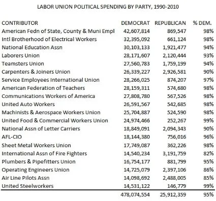 The below chart is the amount of donations that went to Democrats from Union DUES---$478,000,000 Now I am certain that Union members would much prefer that their dues go into their retirement funds--health care funds--vacation funds--etc.--but it is automatically funneled into democrat politicians pockets.