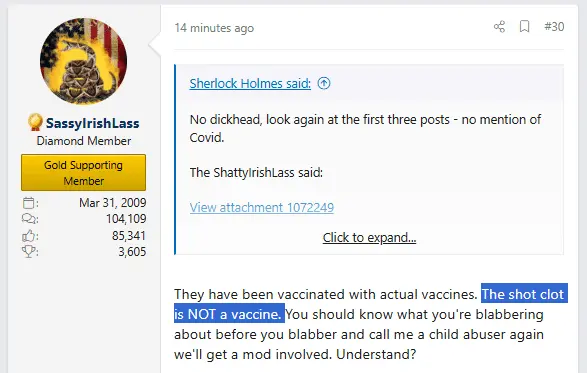 I'm not flaming, I'm disagreeing with your imbecilic claim that a "clot shot" is not a vaccine:You're just flaming, you have no idea what you're even trying to defend and look ridiculous. Just stop