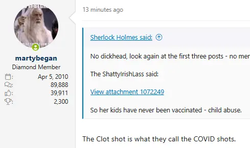 I reported Sherlock's post where he called her a child abuser. I believe that is at least an infraction of this Forum.That's not what I am calling you out on. You pretended she doesn't get her kids any vaccines, and accused her of child abuse.